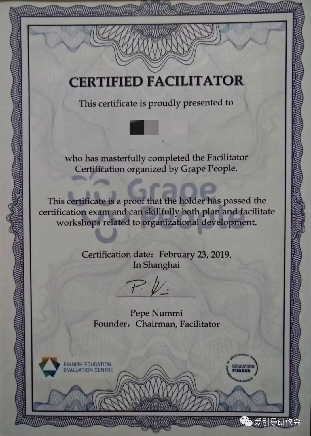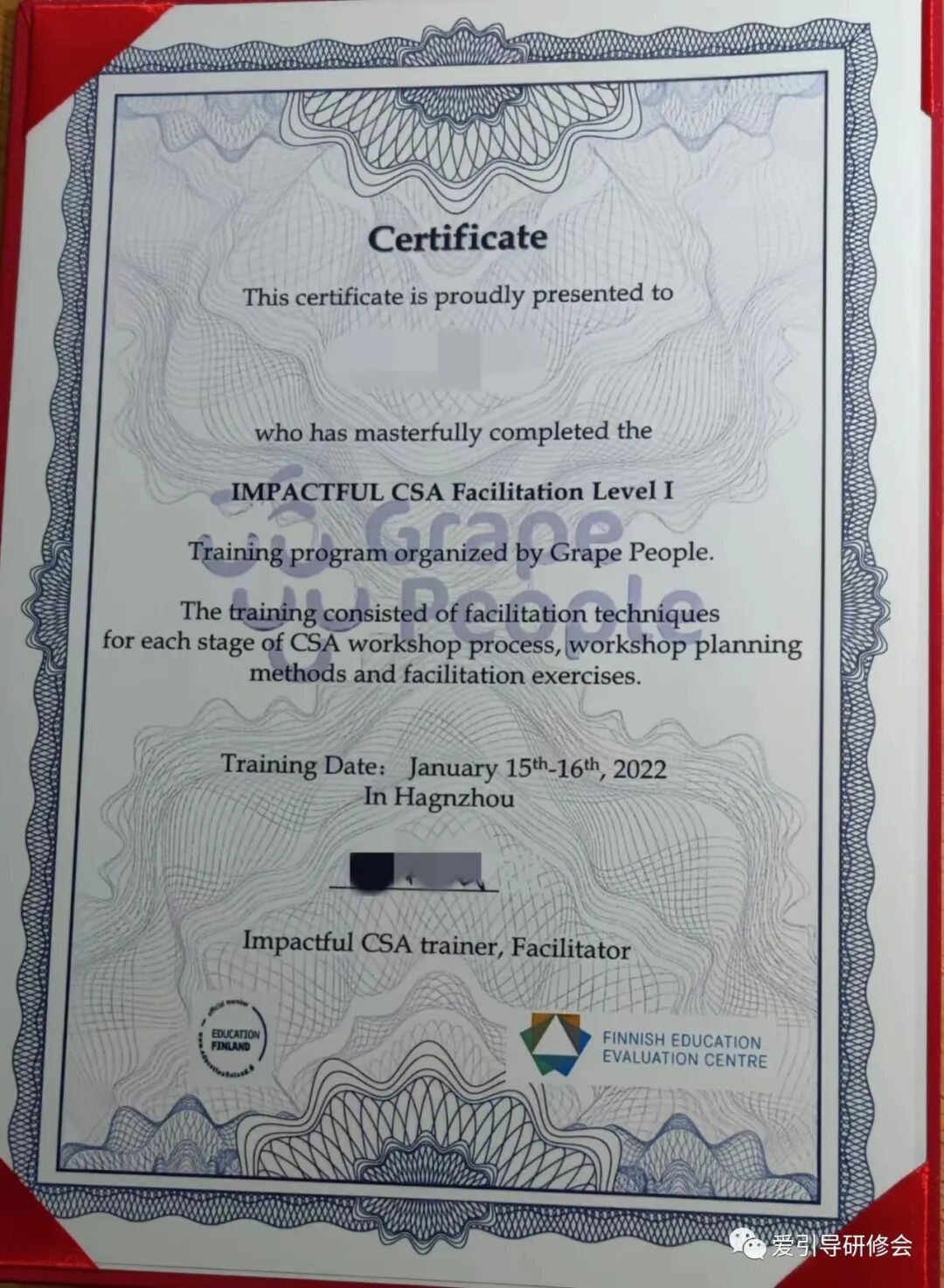 Impactful CSA认证引导师CF认证引导师证书是引导师的资格能力证明证书,由Grape People 颁发(中国大陆地区由葡萄人中国事业部承办),培训内容、教学体系和质量受芬兰教育评估院FINEEC确认。